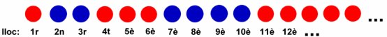 En Joan va posant en una filera, ordenadament, 1 bola de color vermell, 2 de color blau, 3 de color vermell, 4 de color blau, 5 de color vermell, 6 de color blau i així successivament.