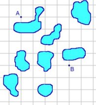 Si cada quadradet fa 1 unitat de costat, quina longitud té el camí més curt que poden aconseguir en Pau i la Nahia per fer anar el robot des de A fins a B sense passar pels llacs?