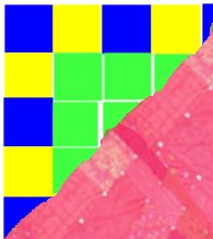 A tot el voltant hi ha posat alternativament peces blaves i grogues; a les quatre cantonades hi ha una peça blava i en total n'ha fet servir una dotzena de grogues i una dotzena de blaves. Totes les peces que ha posat al mig són verdes.